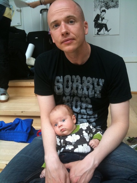 Det slog mig just att vi har slagit oss ner precis på platsen i Kungsträdgården där den dynamiska duon i ”Dannyboy & kärleken” berättar en del sanningar för varandra framåt småtimmarna under sitt hektiska helgdygn. Ännu återstår ett par veckor till Dannyboydagen infaller den 25 maj, men hey, jag tycker nog att det är värt att fira med en bild på nästa generation författare i familjen.