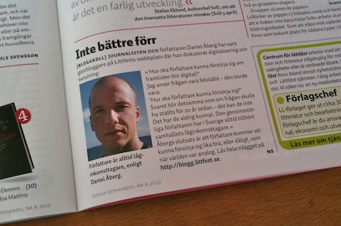 På tal om inget annat så upptäckte jag just att jag tydligen nästlat mig in i en liten blänkare i senaste Svensk Bokhandel, där de på sina bokplockssidor uppmärksammar mina gästinlägg hos Littfest om framtiden för den svenska författaren.