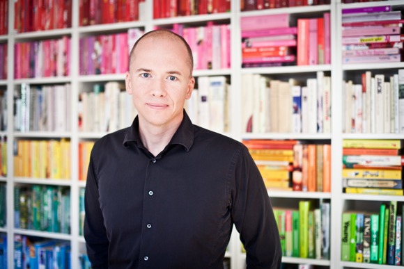 Och nu är framtiden här – uppladdad och redo på pressidan! Fotografen är den fantastiskt duktiga och trevliga Sara Arnald, som kom hem till oss en tidig lördagsmorgon härom veckan och plåtade mig dels framför den tredje upplagan av vår smått berömda (somliga skulle säga ökända) färgsorterade bokhylla, dels mot den vita väggen i Tages rum samt på gatan utanför.