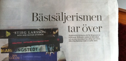 För den delen – bästsäljErism eller bästsäljArism? Jag skrev först med e i mitt inlägg i förmiddags, men ändrade efter att ha kollat i DN:s text, där det genomgående stod med a (fem ställen inklusive faktaruta). Fast nu ser jag ju att de på ettan på kulturdelen, samt i ingressen till artikeln, skriver bästsäljerism.