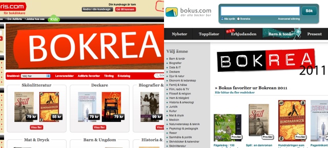 Bokrean är igång! Eller ja, åtminstone på nätet. Eller ja, åtminstone så är förhandsbeställningarna igång på nätet. Bokus öppnade portarna redan i tisdags, och Adlibris i går, och utbudet och priserna är väl som vanligt snarlika med vissa avvikelser åt olika håll. Mina egna priser – jag har valt att ha med båda mina romaner i rean i år – är 19 kronor för ”Dannyboy & kärleken” både hos Adlibris och Bokus, och ”Vi har redan sagt hej då” går för 69 kronor hos Adlibris och 72 kronor hos Bokus. Same same, just slightly different.