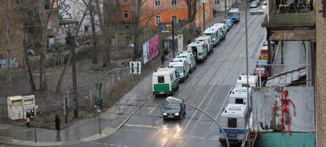 Hur som helst. Nu på fredagseftermiddagen har läget trappats upp igen. När vi kom hem vid 16-tiden var vårt gathörn vid Boxhagener Straße/Holteistraße invaderat av ett drygt tiotal piketbussar, och ett femtiotal poliser stod uppradade längs gatorna. Snett emot vårt kvarter ligger nämligen ett annat ockuperat hus där invånarna verkar ha planerat fest, entrén till gården är prydd med ballonger och ur högtalare i fönstren brassas ”Internationalen” ut på full volym. Några av ockupanterna hade omringats av ett tiotal poliser utanför närbutiken i vårt gathörn, och samtidigt som vi passerade slet sig en av ungdomarna loss och sprang för glatta livet iväg från polisringen, vilket ledde till ett visst tumult. Polisen gjorde dock inga större försök att följa efter honom.